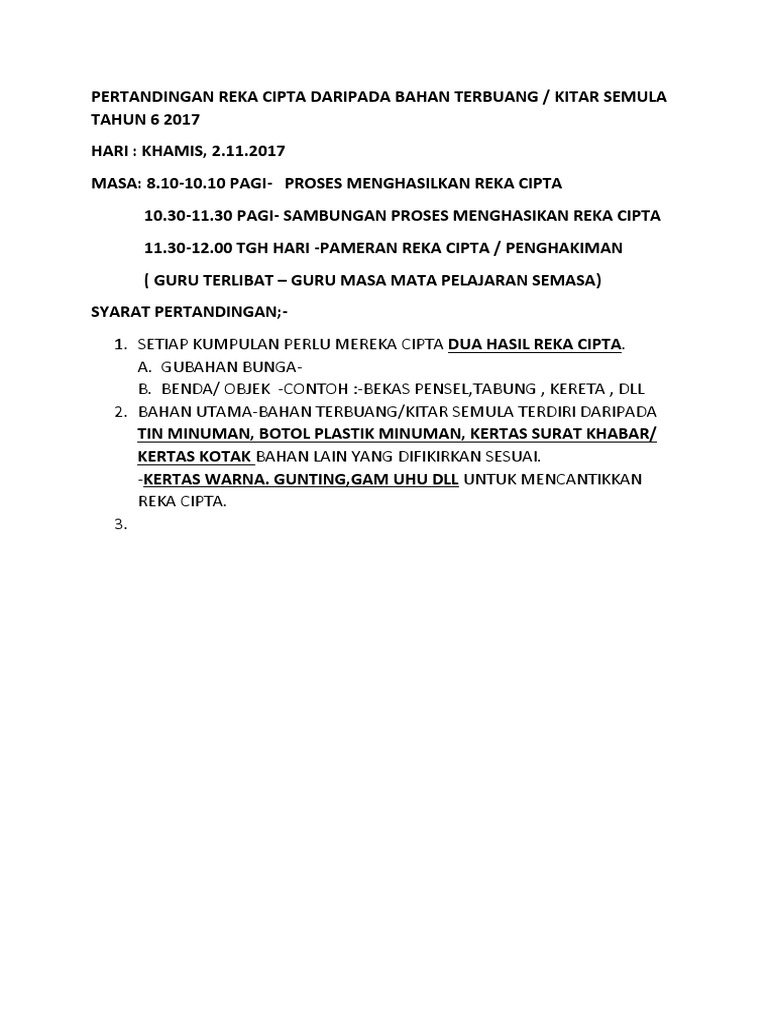 Pertandingan Reka Cipta Daripada Bahan Terbuang Tahun 6