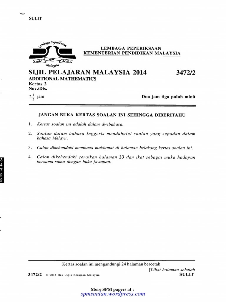 Spmsoalan Soalan Spm 2014 Matematik Tambahan Kertas 1