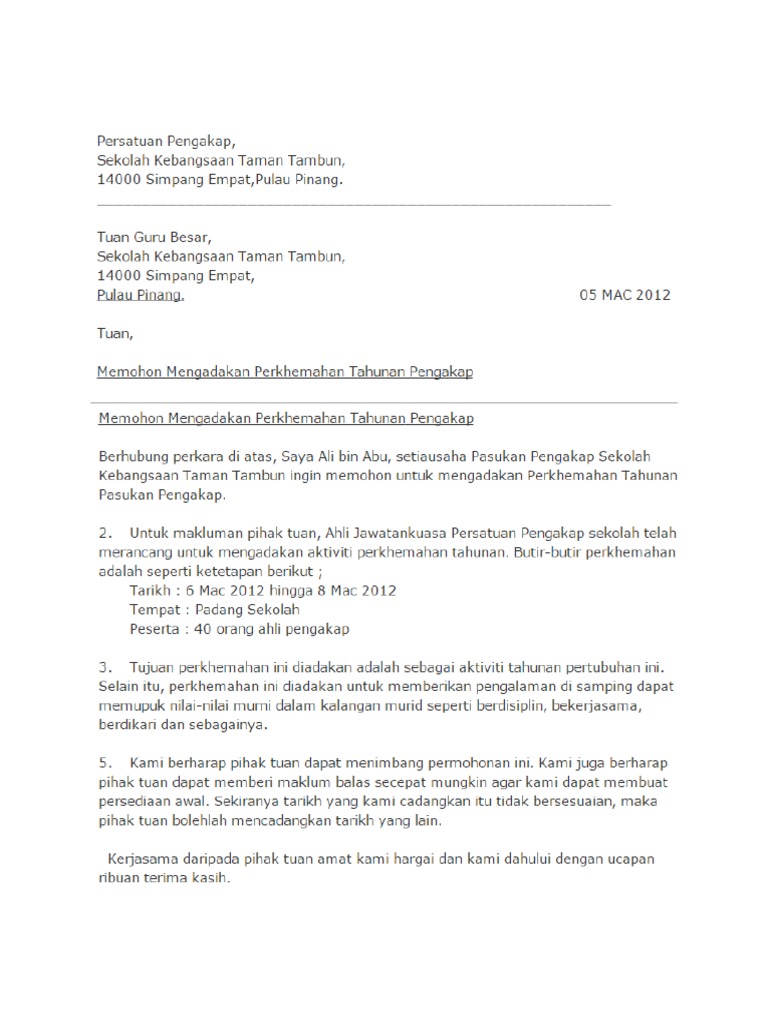 Contoh surat kiriman rasmi. Memohon pekerjaan bantuan lawatan sambil belajar. Sebagai setiausaha kamu perlu menulis surat kepada pengetua sekolah kamu untuk memohon mengadakan perkhemahan tersebut. Perkara isu anda nyatakan tujuan permohonan anda dirangkap yang pertama.