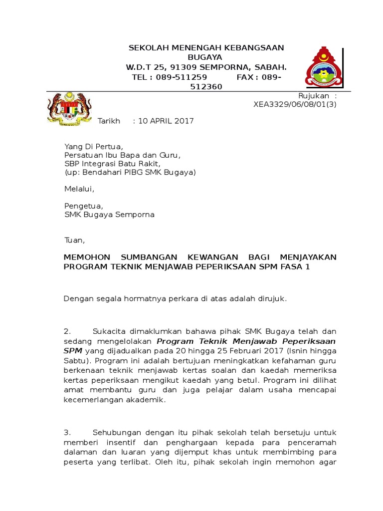 Contoh Surat Memohon Sumbangan Kewangan Daripada Pibg Contoh Surat