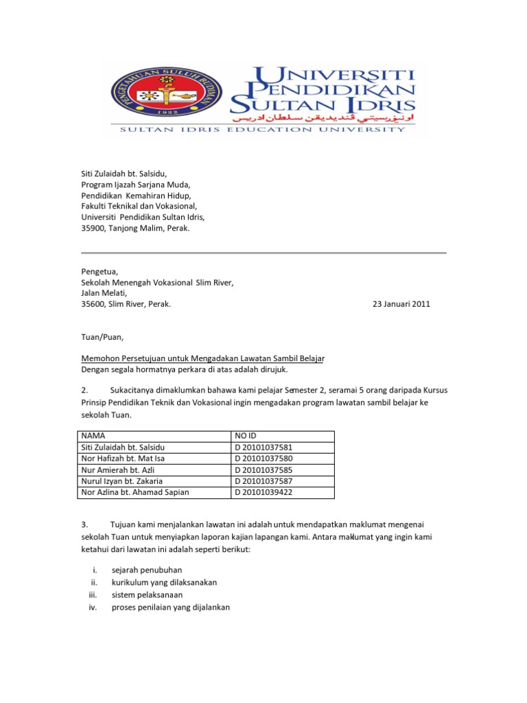 Surat Memohon Kebenaran Mengadakan Lawatan Sambil Belajar