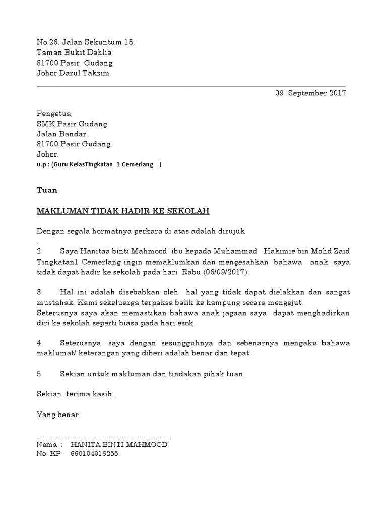 Surat Rasmi Makluman Tidak Hadir Ke Sekolah Surat Rasmi 1