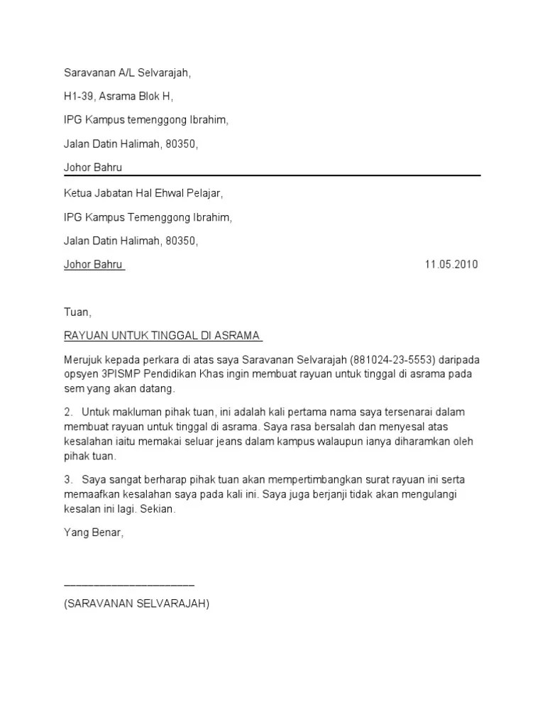 Contoh Surat Rayuan Kolej Kediaman Docx Document Cute766