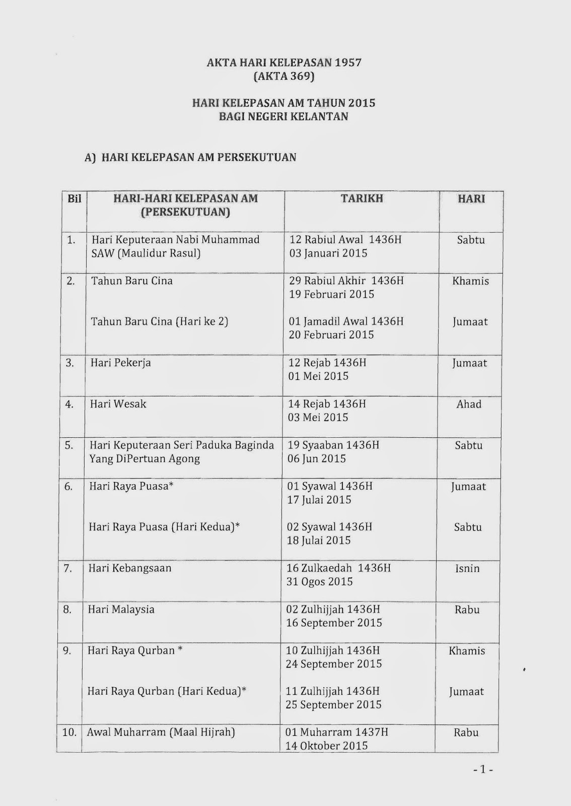 Cuti Umum 2015 Hari Kelepasan Am Public Holiday