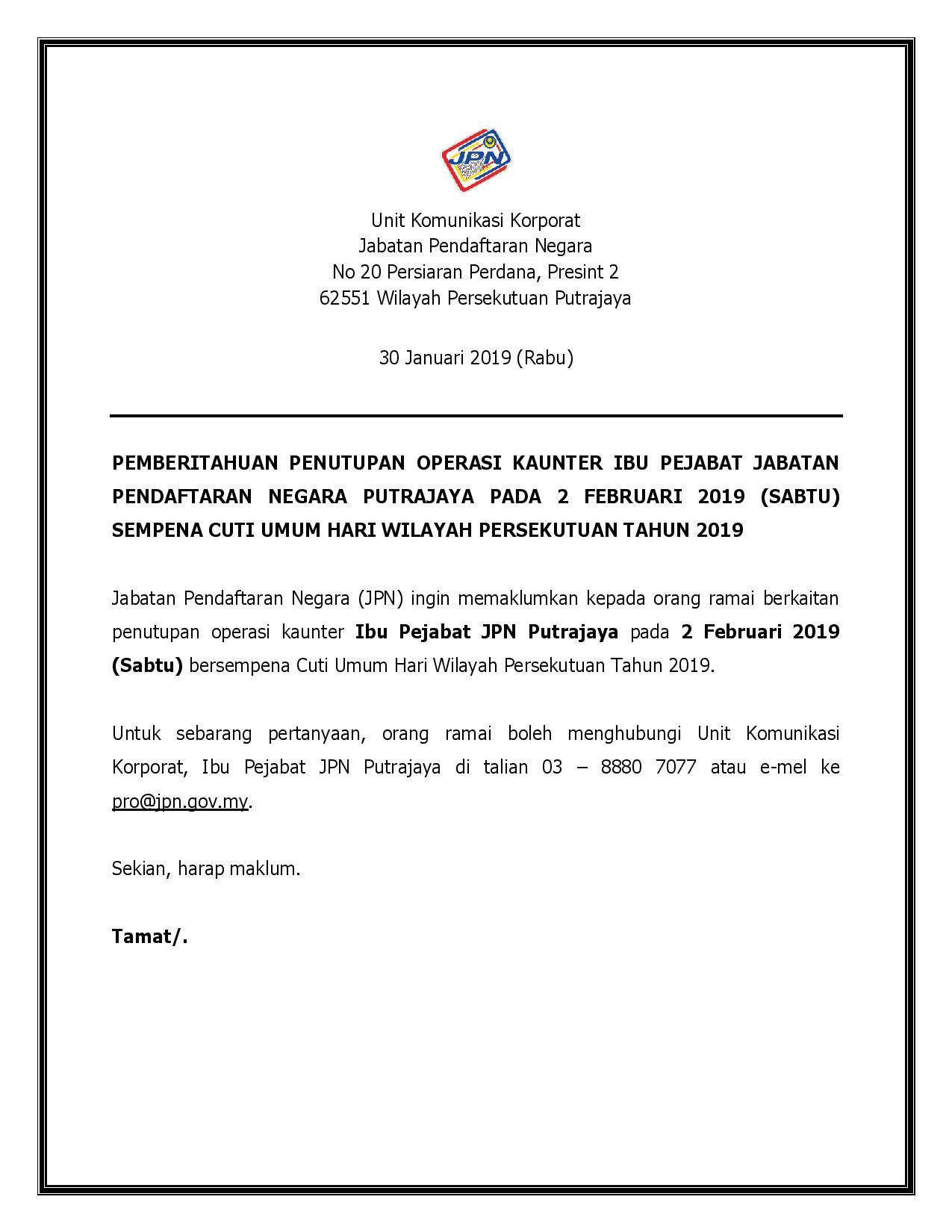 Jpn Malaysia On Twitter Pemberitahuan Penutupan Operasi Kaunter Ibu Pejabat Jpn Putrajaya Pada 2 Februari 2019 Sabtu Sempena Cuti Umum Hari Wilayah Persekutuan Tahun 2019 Https T Co Hoebjqgut9