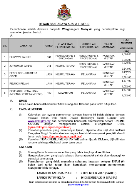 Jawatan Kosong Kerajaan 2017 Di Dewan Bandaraya Kuala Lumpur Dbkl 16 Disember 2017 Appjawatan Malaysia