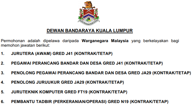 Jawatan Kosong Di Dewan Bandaraya Kuala Lumpur Dbkl Pelbagai Gred Jawatan Jobcari Com Jawatan Kosong Terkini