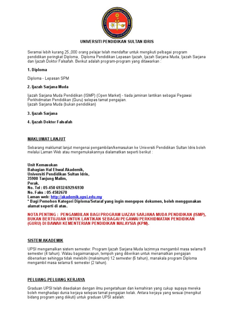 Kemasukan Khas Lepasan Diploma Upsi Ke Universiti Pendidikan Sultan Idris Facebook