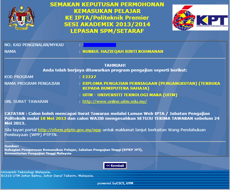 Slip Permohonan Kemasukan Pelajar Ke Universiti Awam Politeknik Kolej Komuniti Ilka Program Pengajian Lepasan Spm Sesi Akademik 2019 2020 Kategori A