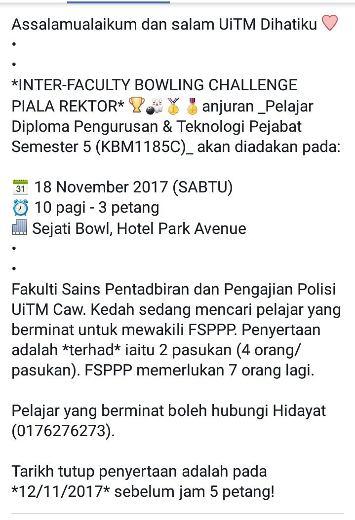 Basic Uitm Kedah V Twitter Inter Faculty Bowling Challenge Piala Rektor Siapa Berminat Boleh Contact Saudara Hidayat 017 6276273