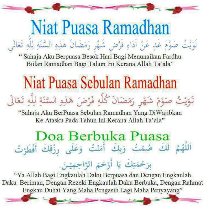 Tak fasih lupe ermm. Ketika berbuka puasa nabi membaca telah hilang rasa haus dan telah basah segala urat semoga kami tetap berpahala insya allah. Selain itu kita juga disunatkan berpuasa enam hari pada bulan syawal puasa hari arafah dan puasa pada hari isnin dan khamis. Doa berbuka puasa untuk seorang dan ramai.