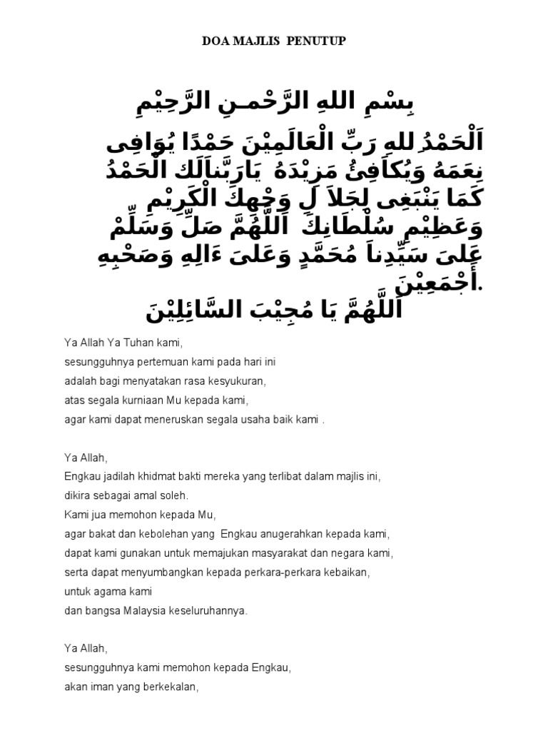 13 13 menganggap dokumen ini tidak bermanfaat tandai dokumen ini sebagai tidak bermanfaat. Simpan simpan teks doa ringkas pembukaan majlis 1 untuk nanti. Bacaan doa majlis rasmi dan tidak rasmi mudah serta ringkas. Bacaan doa pembuka majlis mudah dan ringkas sesuai untuk sebarang majlis perpisahan majlis kenduri kesyukuran ataupun perhimpunan serta perkahwinan.