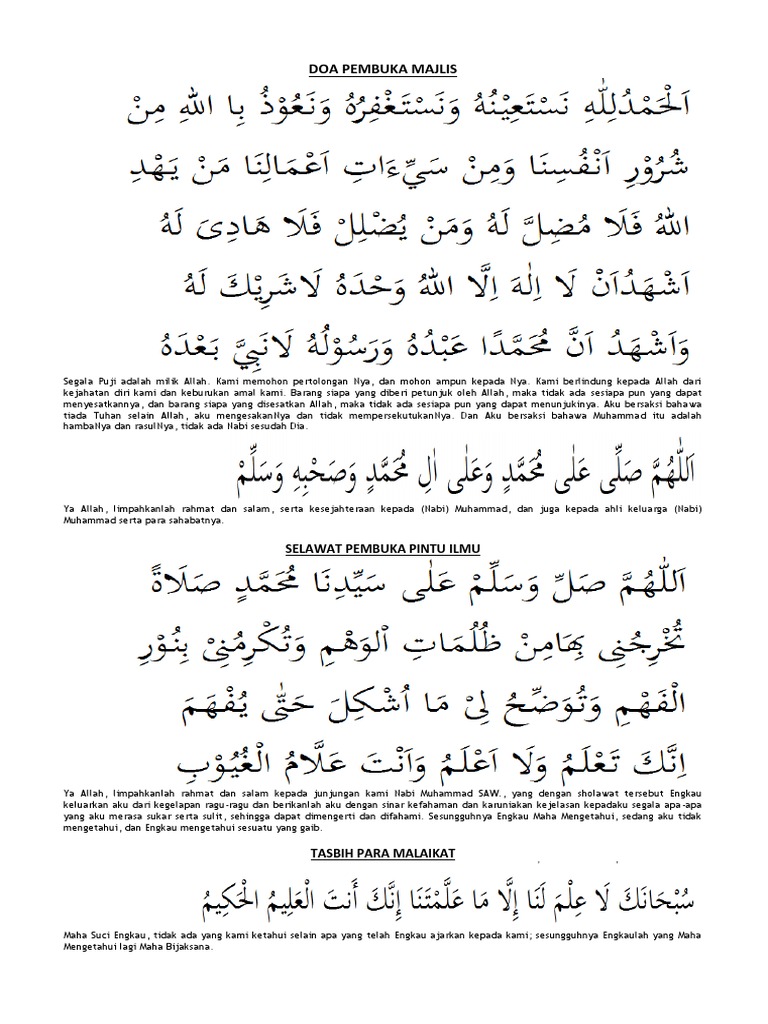 Doa pembuka majlis ilmu. Panduan buat umat islam di malaysia terutamanya yang sering bertugas sebagai pembaca doa samada di majlis rasmi atau tidak rasmi. Kepada individu yang selalu ditugaskan untuk membaca doa kadangkala dipanggil pada saat saat akhir untuk melafazkan doa di hadapan khalayak ramai sebelum sesuatu majlis dimulakan. Doa pembuka majlis adalah doa yang dibaca sebelum memulakan sesuatu majlis. Doa pembuka majelis 4 latinnya.