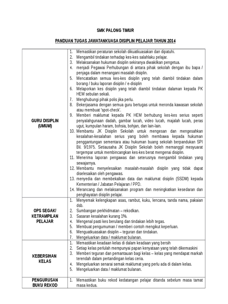Smk Palong Timur Panduan Tugas Jawatankuasa Disiplin Pelajar Tahun 2014