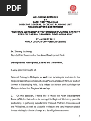 Dato Noriyah Ahmad Epu Welcome Remarks Adb Regional Workshop 27 Jan 2011 Efficient Energy Use Low Carbon Economy