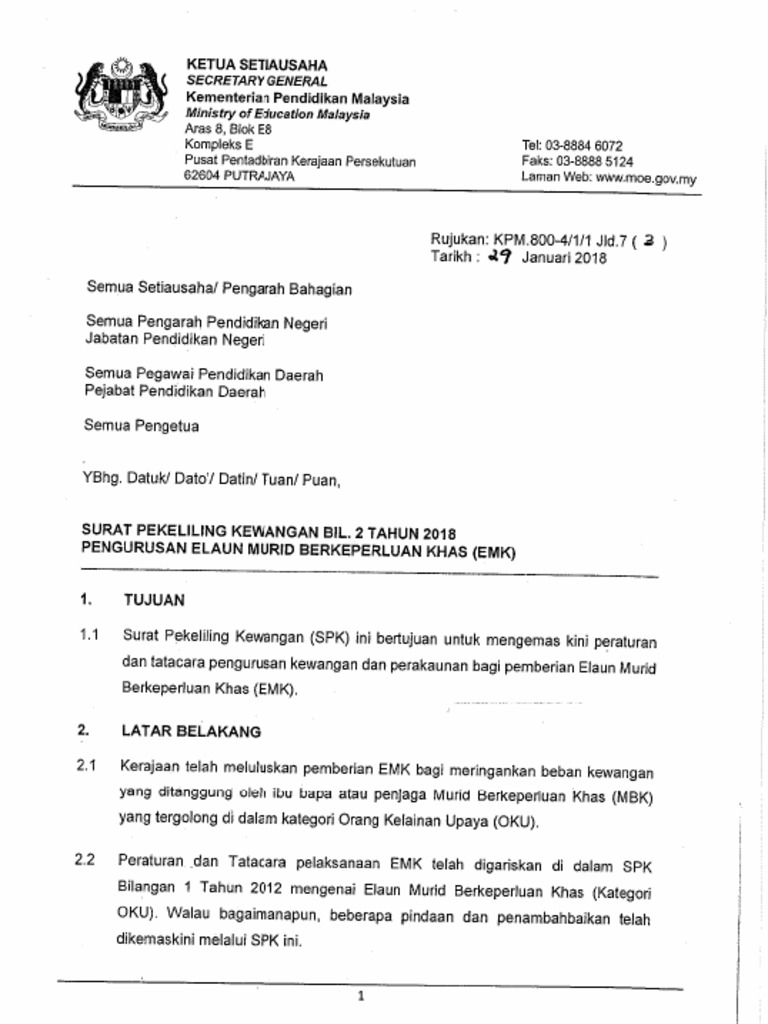 Ruj Kami Surat Siaran Mengenai Pelaksanaan Elaun Murid Berkeperluan Khas Emk Bagi Tahijn 2018 Jika Pdf Document