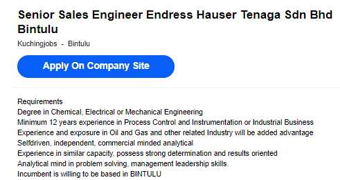 Senior Sales Engineer Endress Hauser Tenaga Sdn Bhd Bintulu Sarawakjobs Com Sarawak Jobs No 1 Job Site In Sarawak Kuching Sibu Miri Bintulu Mukah Sabah Brunei Advertise Part Time Contract Full Time
