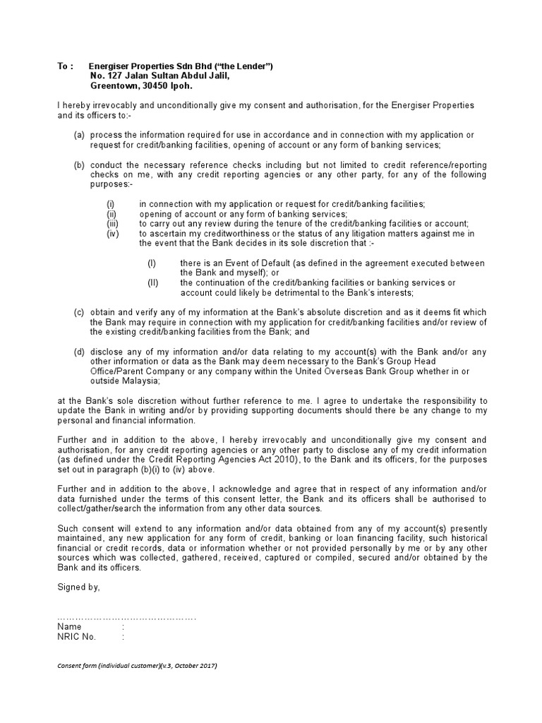 Consent Form Individual Credit Bureau Financial Services