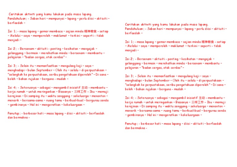 Kita bukan sahaja dapat mengeluarkan pandangan malah dapat juga menjana wang sampingan. Namun begitu anda boleh menambah idea idea yang lebih menarik serta huraian yang tepat dalam memantapkan penulisan karangan masing masing. Masa lapang ini mesti diisi dengan perkara yang berfaedah. Sebagai panduan buat pelajar berikut adalah contoh karangan aktiviti aktiviti berfaedah bagi mengisi masa lapang.