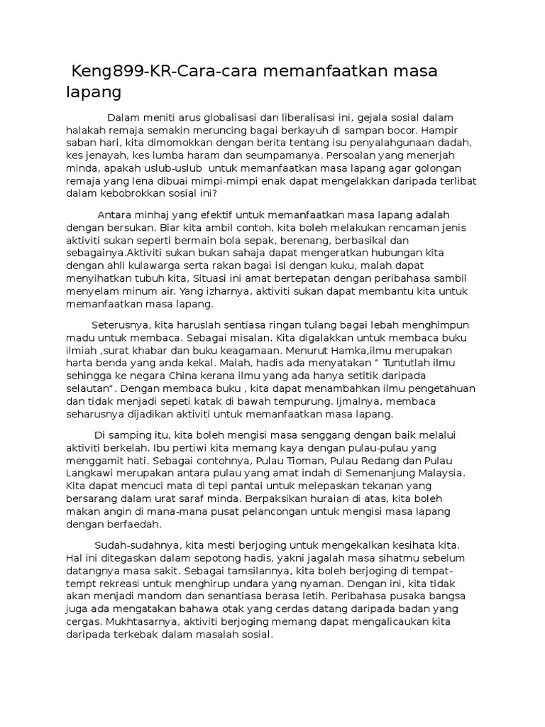 Faedah cara cara mengisi masa lapang karangan. Cikgu zainor din abu hasan. Amiene rev c 2008. Masa lapang yang diisi dengan baik pasti mendatangkan faedah kepada kita. Cara cara mengisi masa lapang.