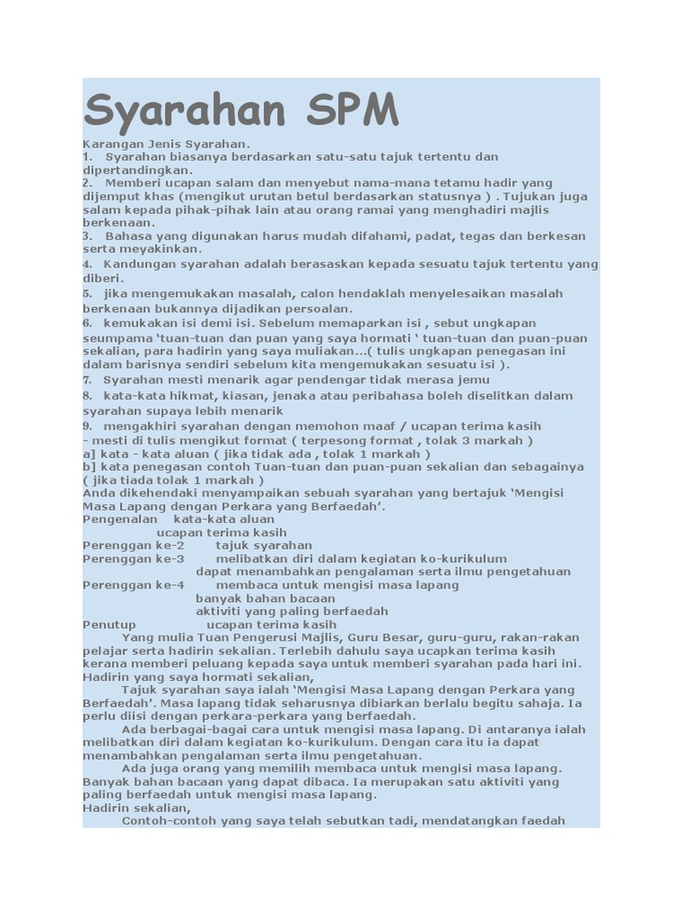 Contoh Karangan Syarahan Spm Cemerlang