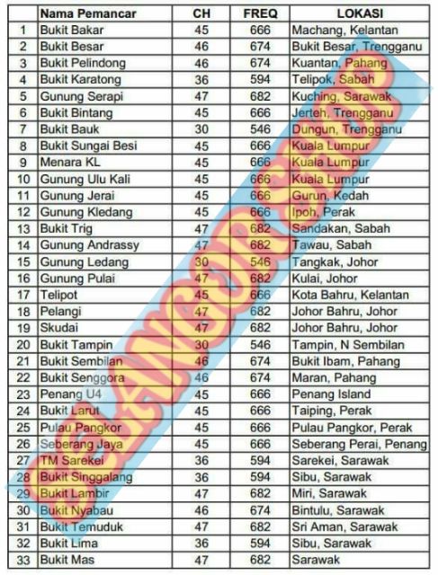 Mytv dilantik untuk membangun dan mengendalikan kemudahan infrastruktur dan jaringan perkhidmatan tv digital di malaysia untuk menghijrahkan system penyiaran negara dari analog ke digital. Senarai stesen pemancar untuk penerimaan siarsn mytv myfreeview di seluruh malaysia termasuk sabah sarawak sehingga september 2017 decoder untuk tonton siaran digital mytv myfreeview no monthly fees tv channel. Mytv adalah inisiatif kerajaan malaysia dalam menambah baik landskap penyiaran tanah air dengan cara mengubah penyaiaran secara analog kepada digital. Highlighted in blue change of frequency for 19 transmitter stations no.