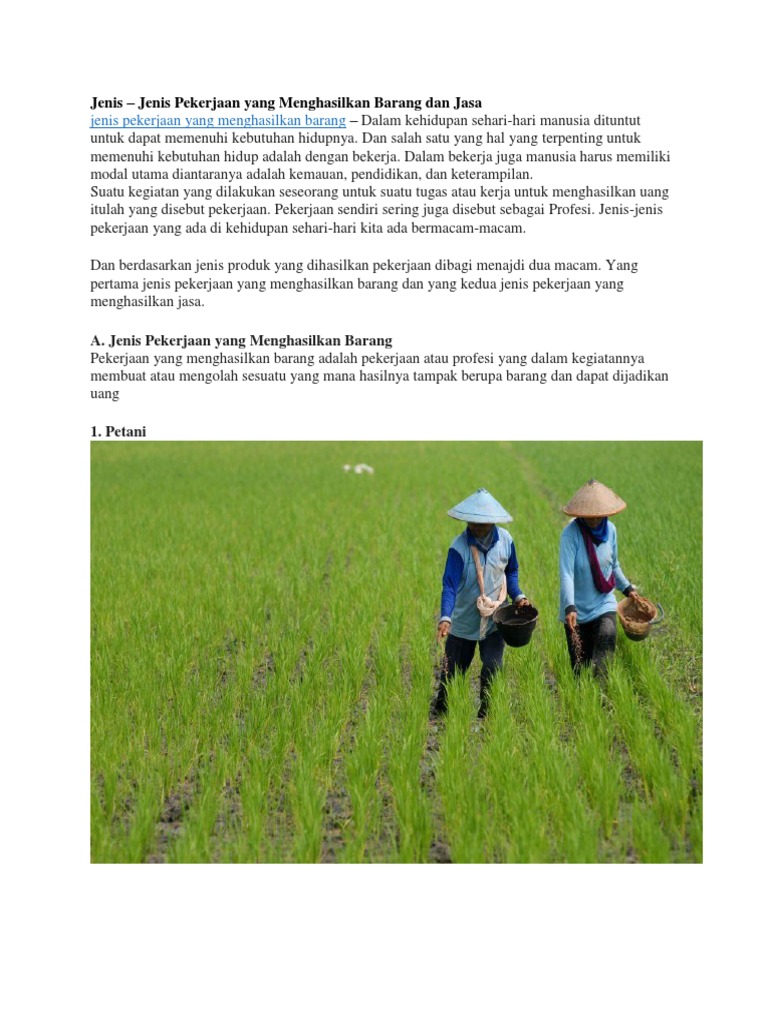 Gambar jenis jenis pekerjaan yang menghasilkan barang dan jasa. Macam jenis profesi pekerjaan dan gambarnya bekerja menjadi salah satu cara manusia dalam mempertahankan hidupnya dan pekerjaan adalah sesuatu yang dilakukan oleh manusia untuk mendapatkan uang pekerjaan dibedakan menjadi 2 macam yaitu pekerjaan yang menghasilkan barang dan ada juga pekerjaan yang menghasilkan jasa. Jenis pekerjaan yang menghasilkan barang dalam kehidupan sehari hari manusia dituntut untuk dapat memenuhi kebutuhan hidupnya. Namun secara umum dibagi menjadi dua jenis yaitu pekerjaan yang menghasilkan barang dan pekerjaan yang menghasilkan jasa. 15 jenis barang dan jasa dan contohnya barang dan jasa merupakan alat alat pemuas kebutuhan manusia yang sifatnya tidak terbatas.