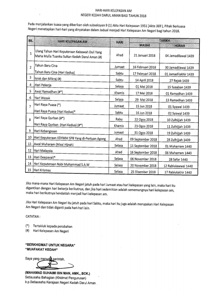 Jadual Cuti Umum Kedah 2020 Hari Kelepasan Am My Panduan