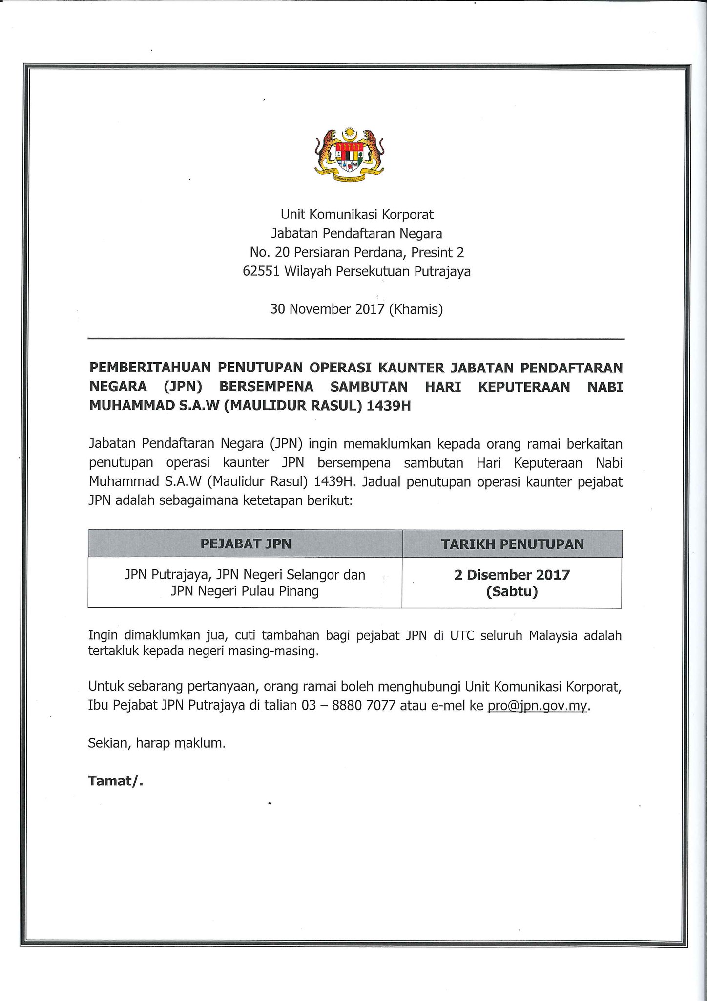 Jpn Malaysia בטוויטר Pemberitahuan Penutupan Operasi Kaunter Jpn Bersempena Sambutan Hari Keputeraan Nabi Muhammad S A W Maulidur Rasul 1439h Https T Co Tltw5myi7g