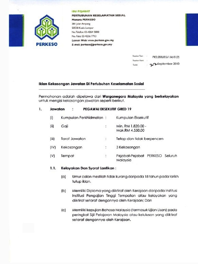 Iklan Jawatan Kosong Dan Borang Jawatan Perkeso Oktober 2010