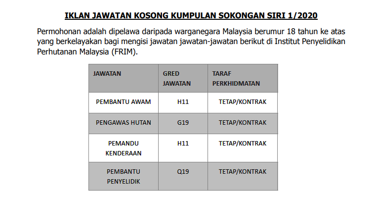 Senarai Kekosongan Jawatan Institut Penyelidikan Perhutanan Malaysia Frim Untuk Pencari Kerja Graduan Baru Tahun 2020 Portal Kerja Kosong Graduan